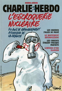 Achetez, volez [et téléchargez] Charlie et enfermez la télé à double tour. Éternellement jeune, tout comme le nucléaire, l'équipe de Charlie saute à pieds joints sur EDF, Areva et tous les petits salopards qui nous ont légué 58 réacteurs nucléaires. Au programme, des histoires, des révélations, des coups de projecteur dans les coins les plus sombres de l'industrie la plus folle de tous les temps. Embarquez ! et n'oubliez pas vos pastilles d'iode. Ça ne sert strictement à rien, surtout au milieu du grand bordel d'une catastrophe, mais ça fera plaisir à notre belle Autorité de sûreté nucléaire (ASN). Embarquez ! et n'allez plus vous plaindre de ne pas être au courant. Ce hors-série de Charlie contient tout ce qu'il faut savoir pour détester les atomistes associés. À punaiser partout où c'est possible. Et même ailleurs.