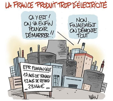 Par ailleurs, le Web est inondé de pseudos articles (rédigés par Intelligence artificielle) qui ne se contentent plus de tourner l'actualité dans tel ou tel sens, mais qui inventent carrément n'importe quoi. Ainsi, on découvre chaque matin de prétendues « avancées décisives » dans la maîtrise de telle ou telle technologie nucléaire « révolutionnaire » réalisées par les Chinois, ou les Américains, ou les Martiens, peu importe. Heureusement, chacune et chacun peut se raccrocher à une certitude absolue : le réacteur EPR de Flamanville est bien la plus grosse blague du siècle. Ce machin a été achevé en 2024 avec 12 ans de retard et pour la modique somme de 23 milliards au lieu des 3 prévus au départ.