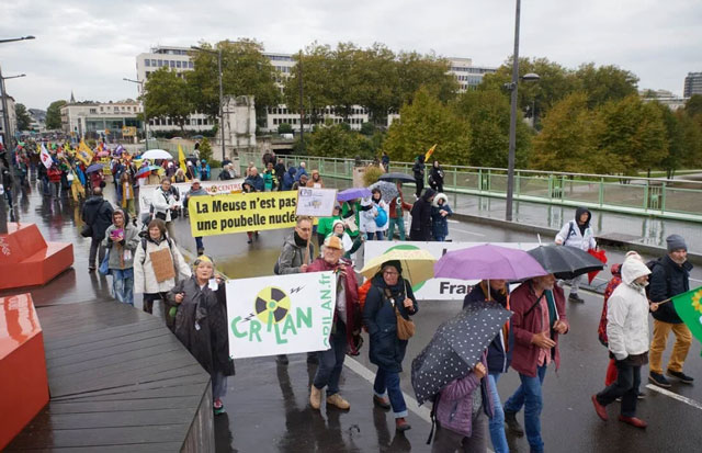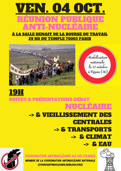 Pour préparer la manifestation nationale du 12-13 à Rouen et Penly, la Coordination régionale IdF avait organisé le 4 octobre une réunion publique à la Bourse du Travail de Paris. Le nombre des participants était modeste, mais la discussion intéressante. Ont été développés les thèmes suivants : l'impact du nucléaire sur l'eau, puis sur le climat, les risques que nous fait courir la prolongation de vie des vieilles centrales, indissociable du programme macronien de relance, et enfin et l'importance ignorée des 19 000 transports annuels de matières radioactives qui sillonnent le territoire.