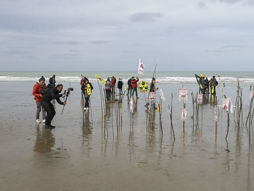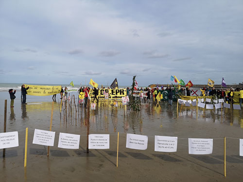 Les bâtons plantés en symbole de la résistance antinucléaire viennent marquer sur la plage notre détermination à lutter contre l’installation de nouveaux réacteurs, en Normandie et partout ailleurs, et contre tous les nouveaux projets atomiques (Giga poubelle souterraine à Bure, production de tritium pour la Bombe à Civaux, etc.). Un mur de la honte dénonce les multiples nuisances du nucléaire.