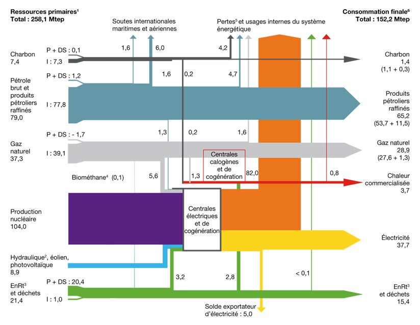 LÉGENDE (plus de détails en cliquant sur l'image) : Se trouvent à gauche du tableau les sources de production énérgétiques en millions d'équivalent pétrole (Mtep). P + DS signifie : production nationale et destockage / I : importation). Et à droite la consommation finale. Les flèches montantes représentent les pertes, donc l'énergie produite qui n'est pas utilisée. On constate pour le nucléaire que ces pertes sont colossales (près de 30% d'efficacité seulement), et sont rejetées sous forme de chaleur dans l'atmosphère par la vapeur, et dans l'eau par les circuits de refroidissements.