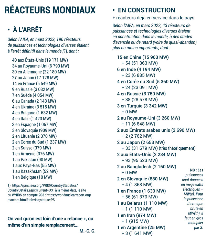 Le nucléaire dans le monde continue de régresser, selon le World Nuclear Industry Status Report (WNISR), la seule source alternative aux documents de l’Agence internationale de l’énergie atomique, dont les données remontées par les États sont plus ou moins à jour.