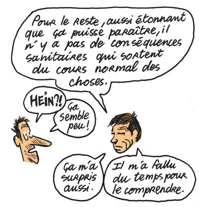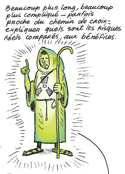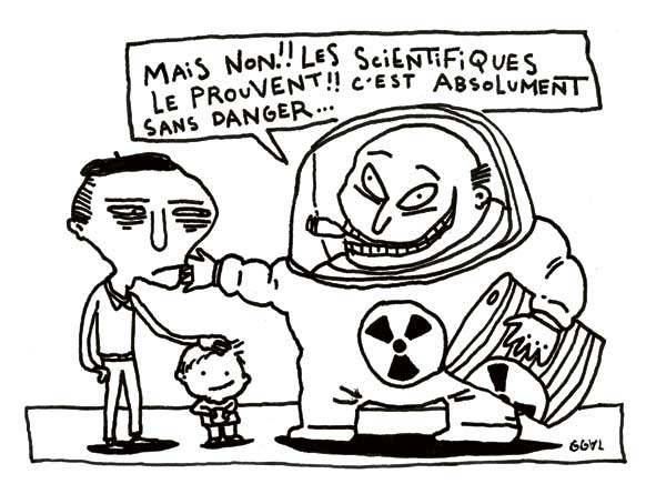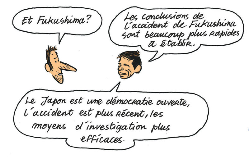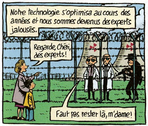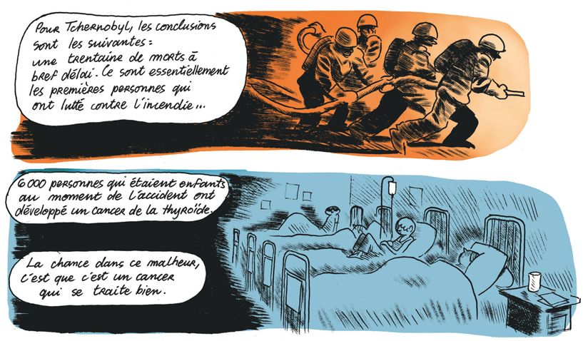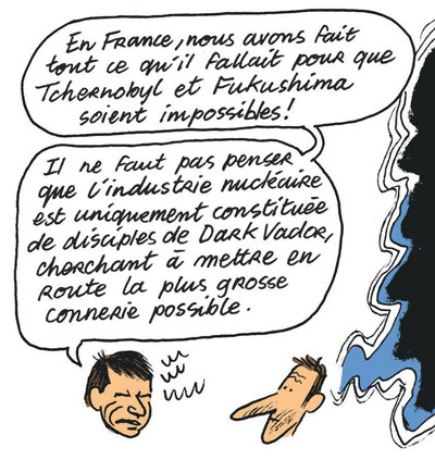 [Dans cette BD] les informations traitant du nucléaire se veulent généralement rassurantes. Pour chacun des accidents historiques évoqués, il est expliqué que la faille qui a conduit à cette catastrophe n’existe pas dans les réacteurs EDF et que, de toute façon, le nombre de morts résultant du nucléaire a toujours été beaucoup plus faible que celui dû aux accidents de la route ou aux mines de charbon.
